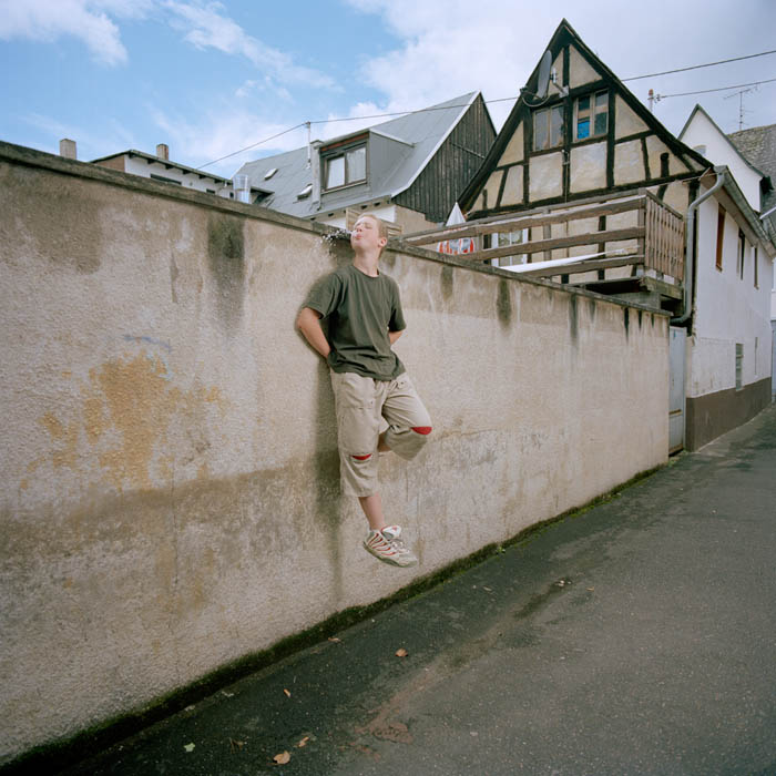 I developed a concept with which I could combine my passion for antigravity and my interest in the people of the city. I decided to actively approach people and positioned myself in exposed places that significantly contribute to the image of the city. I then asked people passing by for a staged portrait. They were people who got my attention through their clothes, charisma, pose etc. I portrayed them off the ground, hanging on walls, trees and lanterns. Like lost items who are placed clearly visible to everyone where they have been found (eg a glove on a fence). Through placing the people at typical locations of the town I could integrate documentary and historical aspects in a casual way. This way new perspectives on familiar places could be gained. This included the historical centre with its picturesque streets as well as the “eyesores /blemishes of Koblenz” which are just as typical for the town.
