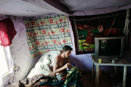 Roma man seen getting ready for work inside his ramshackle dwelling on Craica, an informal Roma settlement in Baia Mare, May 2, 2012.