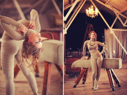 We started in a cluttered corner with an overly-bright flash, but drew away to play exclusively with a couple of very appropriate pommel horses, over which she instantly started leaning, laying, doing the splits, and then, whilst I was tweaking my camera settings, springing up and hanging from the bars over the room.